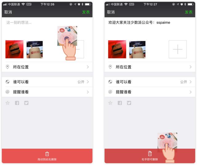 经常晒照片的朋友常用的一个晒图手法就是九宫格晒图。即使没有拍九张照片也会在中间添加白色的背景占位。所以选择照片后。一定要进行一个排序才可以达到我们需要的效果。在某一次更新中。微信悄悄的加入了这个排序功能。当你长按已经添加的照片时可以随意拖拽它的位置。方便大家更优雅的晒图。也可以直接拖拽至底部。来删除你不需要的图片。