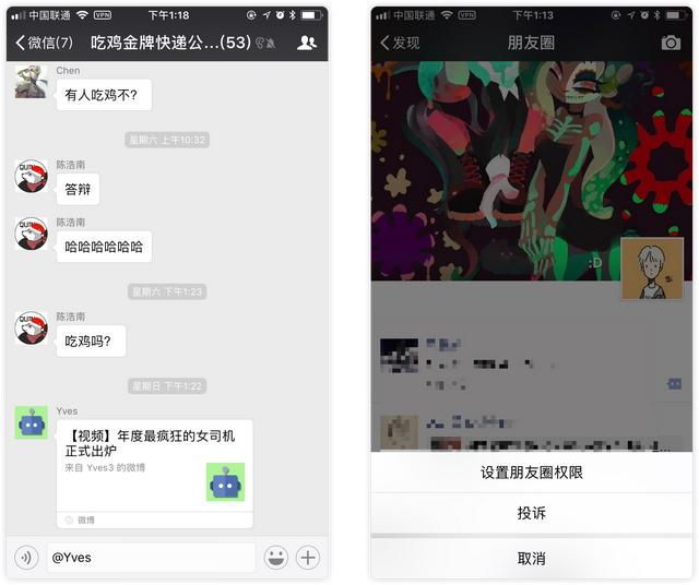长按不仅可以用在消息气泡上。也可以用在头像中。当你在群组里进行聊天时。你可以通过长按用户的头像来快速 @ 他;在朋友圈里。你也可以长按用户的头像来设置某一个人的朋友圈权限或是进行投诉。