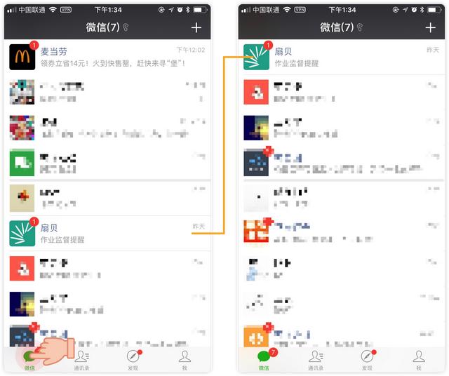 如果你的微信号是和工作相关的。那列表上一定有很多聊天窗口。其中还混杂着一些你关闭了通知的群组。当有个人消息来的时候。也会被聊天群组的群组挤到后排。微信为用提供了一个更快速定位到未读消息的办法。你可以用手指双击左下角的微信图标即可快速移动至相关消息。