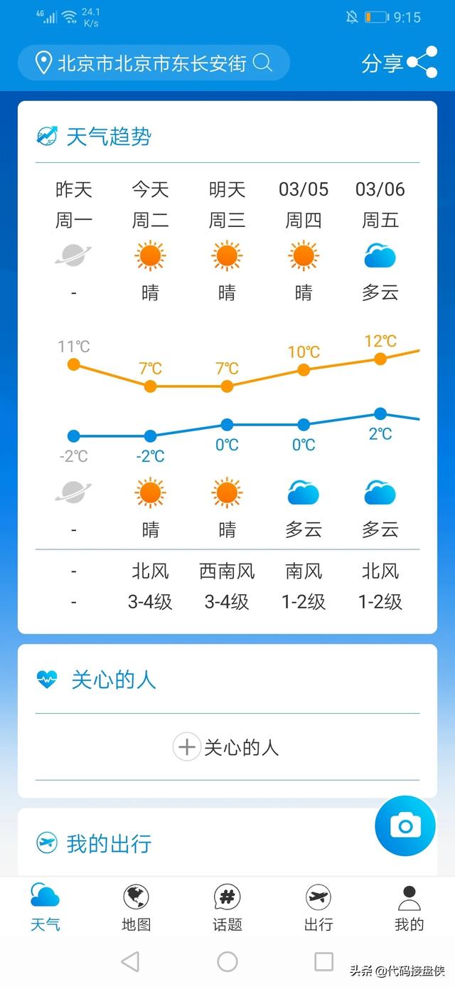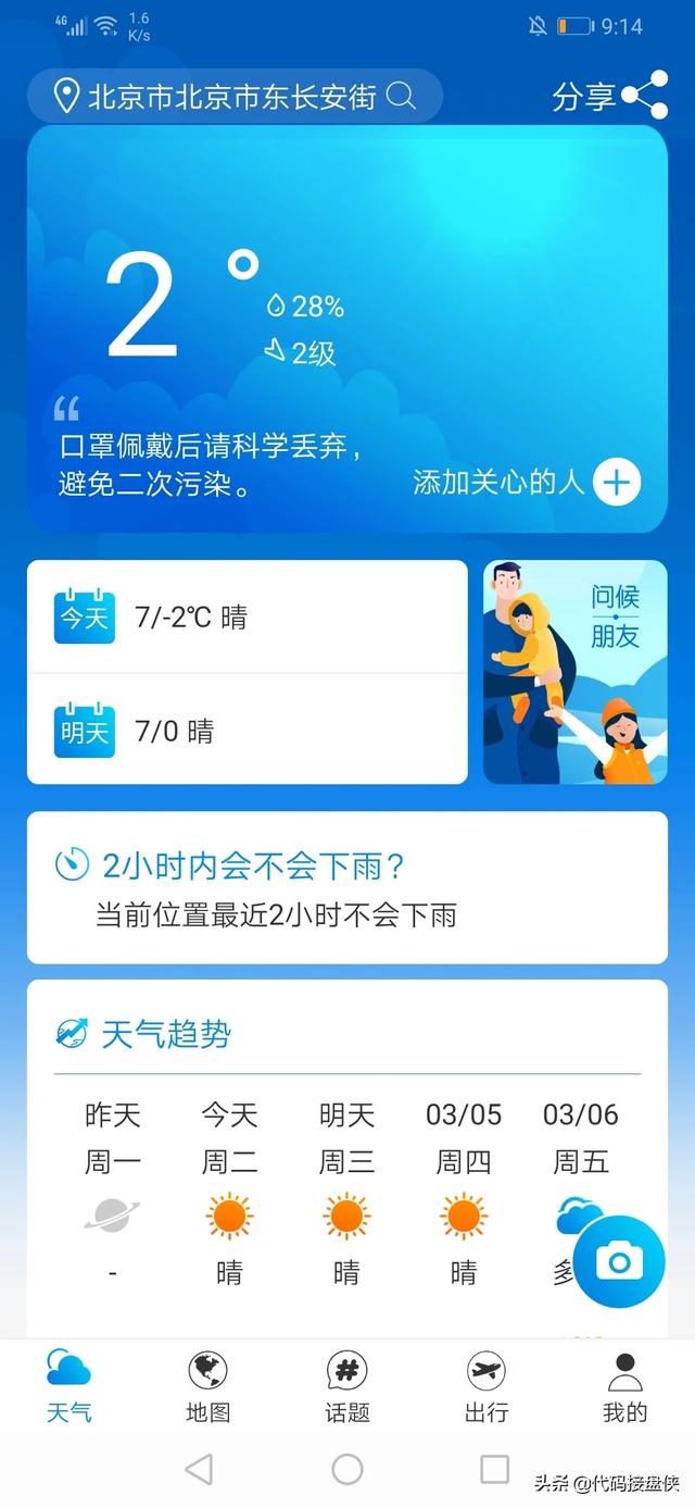 天气预报推荐我现在用的这款天气说App。界面首页就是天气状况。温度。风力。湿度。还有温馨小提示。最主要的是没有广告。这点还是比较好的。
