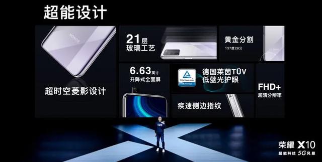 荣耀X10为6.63英寸升降式全面屏。屏占比高达92%。支持1080P超高清分辨率。机身背后为超时空菱影幻变设计。由21层玻璃纹理完美演绎!竞速蓝、探速黑。光速银和燃力橙共4种配色。疾速侧边指纹。指关节截屏通通带给大家。