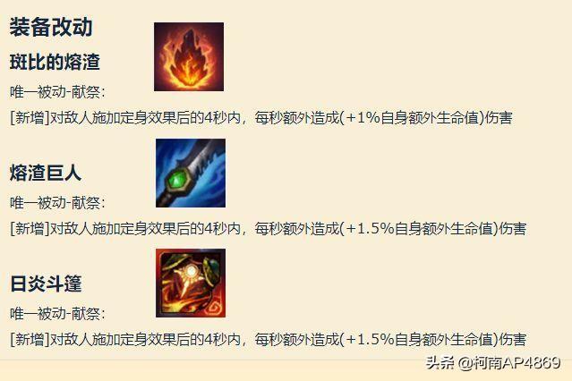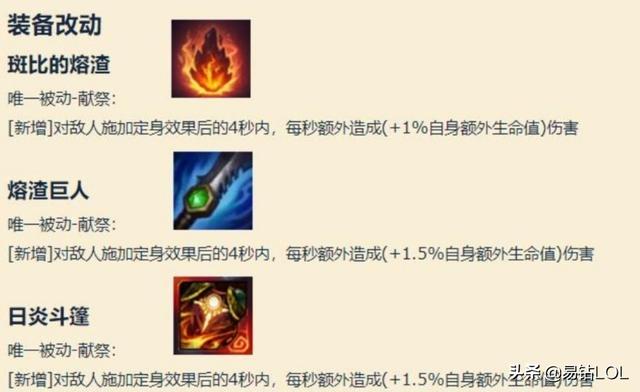 为了抑制刺客英雄的崛起。拳头官方更改了两件装备的属性。他们分别是熔渣和日炎。新增对敌人施加定身效果后的4秒内。每秒额外造成1.5%自身额外生命值的伤害。也就是说英雄穿上这两件装备之后。烫人的伤害又高了一些。这种改动无疑是加强坦克类英雄。让他们对线不虚刺客英雄。