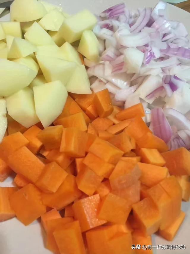 胡萝卜。土豆洗净去皮切成小块(或者切成小条都可以)。