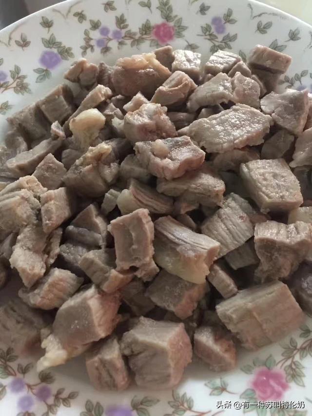 把牛腩切成小块。然后用流动的水反复冲洗干净。把牛腩血水冲洗干净。