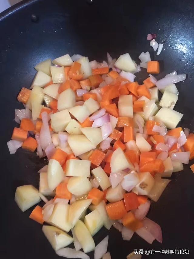 不断翻炒至胡萝卜和土豆表面收紧边缘有些焦黄。然后装盘备用。