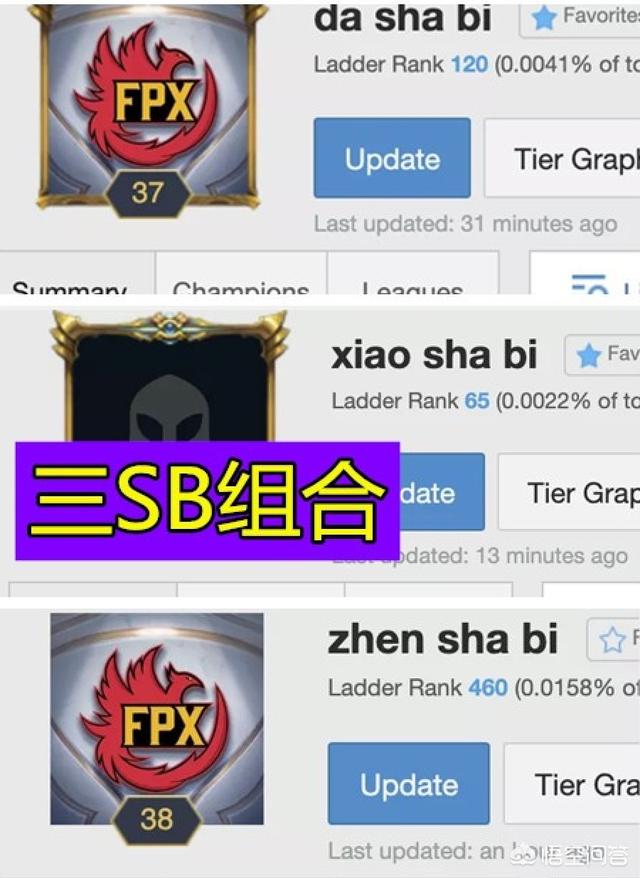 就在近日。有网友查询了一下FPX战队的一个欧服排位情况。毕竟小组赛就要开打了。很多网友都非常关心他们的一个状态。作为LPL的一号种子。FPX战队可以说是很受国内玩家的一个期待的。但是当看到FPX战队成员的ID之后。顿时引发了网友的一个热议。因为FPX战队的ADC选手LWX竟然带头搞事情。将自己的ID改为da sha bi、然后上单金贡和打野新一也纷纷效仿。一个把ID改为xiao sha bi、另一个把ID改为zhen sha bi。三个人的IG组合在一起就成了“三SB组合”。