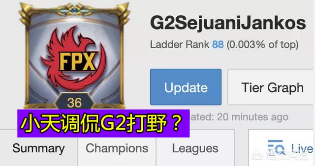 最有意思的当属打野小天的的欧服ID了。在前些天的时候。G2的打野选手Jankos抱怨过教练老给他选猪妹这个英雄。透露出他不喜欢玩猪妹这个英雄打野。于是FPX战队的打野小天直接把ID改成了:G2SejuaniJankos(G2瑟庄妮Jankos)。小天的这个ID有点调侃G2打野选手Jankos的意思啊。G2战队是今年最被看好夺冠的战队之一。FPX则是我们LPL的一号种子。小组赛是碰不上了。不过很期待他们在淘汰赛能交手一次啊!