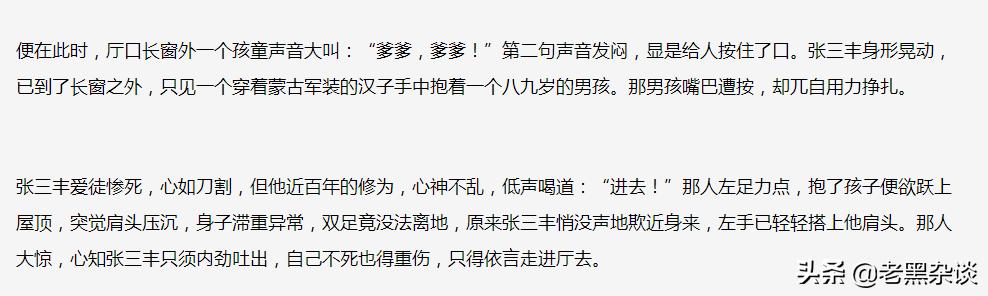这里咱们再插一句。很多人以为张三丰擒拿鹤笔翁是偷袭。可小说中。鹤笔翁抱着张无忌潜伏在屋外监视。张三丰听到声音。身形一晃就到了鹤笔翁身边。低声喝道:“进去。”鹤笔翁想逃。被张三丰一招给制住了。