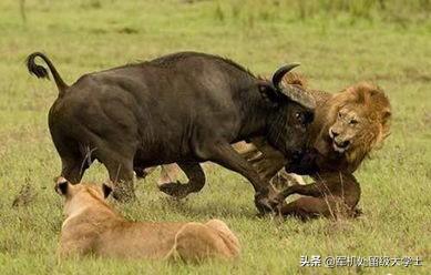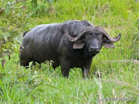 非洲野牛也就是非洲水牛。非洲水牛在非洲大草原上体型可以排在第四位。仅次于大象、犀牛、河马。作为最常与非洲狮子交手的动物。非洲水牛最大的天敌就是狮子了。但是。据统计。每年杀死狮子最多的却是非洲水牛。