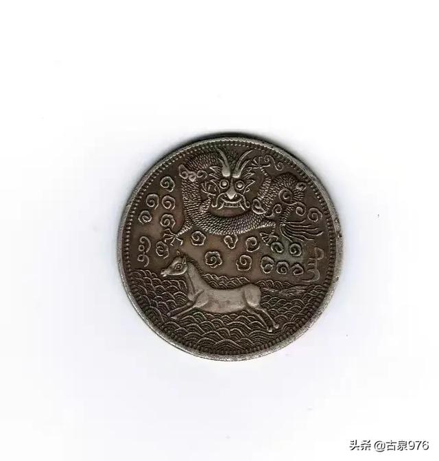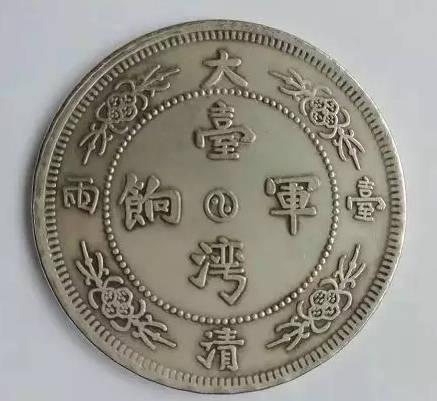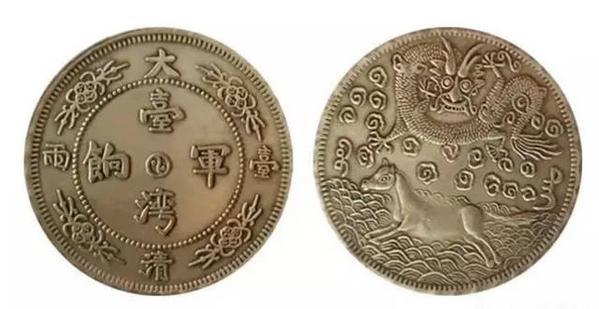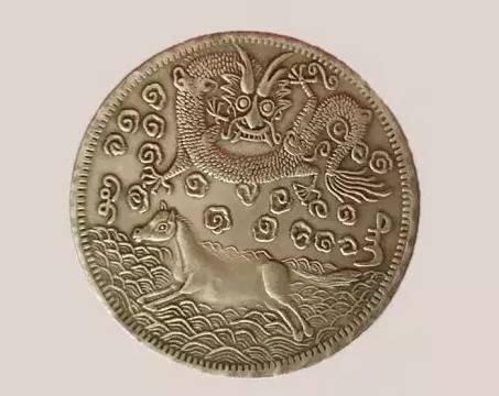 谢邀你好题主。图片上的这枚钱币。正面大清壹两中间台湾军饷中心阴阳八卦图。背面上为张牙舞爪龙图案。下面海水纹上有跑马图案。