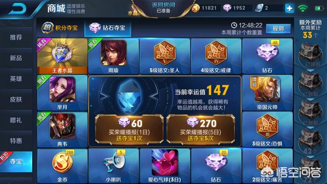 还有一种是积分夺宝。抽一次消耗60积分。积分是点劵兑换的。一点劵相当于10积分。通过积分夺宝会获得荣耀水晶。
