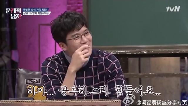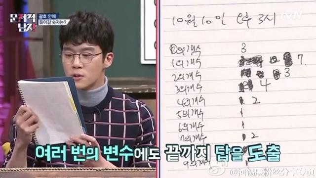 在tvN新推出的烧脑益智综艺节目《大脑性感时代问题的男人》中(这是个探讨有关社会问题的智能辩论节目)。河锡辰多次展示出自己的高智商大脑。哦。对了他的IQ是132~~好像说是没有什么数学题能难道他呢~百分百纯工科男~