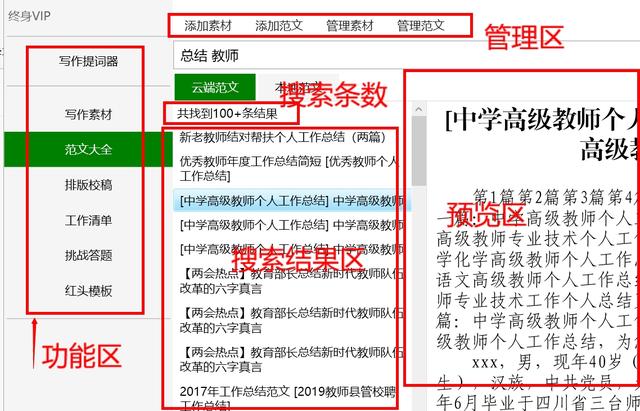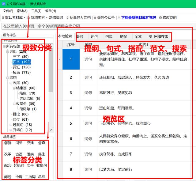 一键范文搜索(内置到word/wps中)独立范文、素材及本地素材管理:素材极致分类。高效检索:覆盖各场景、关键词、类型、