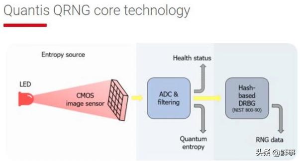 与PRNG相比。TRNG从物理现象中提取随机性。并将其引入计算机中。比如说大气噪声。它很容易被普通收音机接收。再比如QRNG芯片。它的随机性是通过CMOS图像传感器捕获的光源发出的“散粒噪声”来实现的。芯片中包含一个发光二极管(LED)和一个图像传感器。并且由于所谓的量子噪声。该LED发出随机数量的光子。然后。这些光子被图像传感器像素捕获并计数。并提供一系列输入到随机位发生器算法中的随机数。