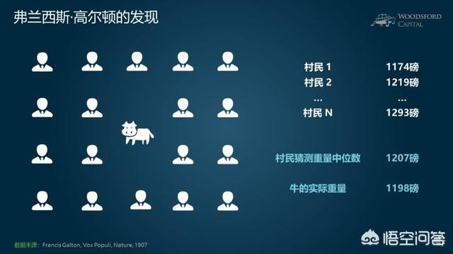 举例来说。英国学者弗兰西斯·高尔顿在1907年《自然》杂志上发表论文。和读者们分享了一个非常有趣的“村民猜牛体重”的故事。