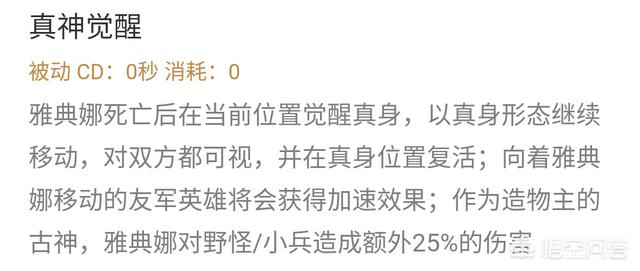 ①被动技能 雅典娜死亡后在原地觉醒真身 并以真身继续移动。向着雅典娜移动的对友将增加20%的移速。双方都能看到雅典娜真身。并且雅典娜在真身位置复活。对非英雄的地方单位造成额外25%伤害(刷野速度更快)