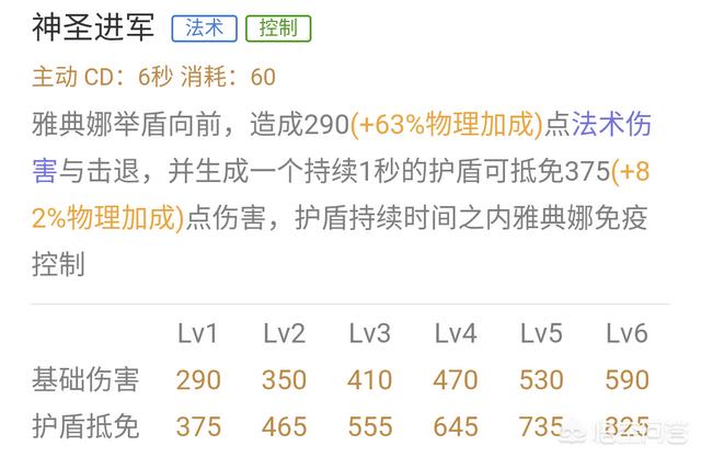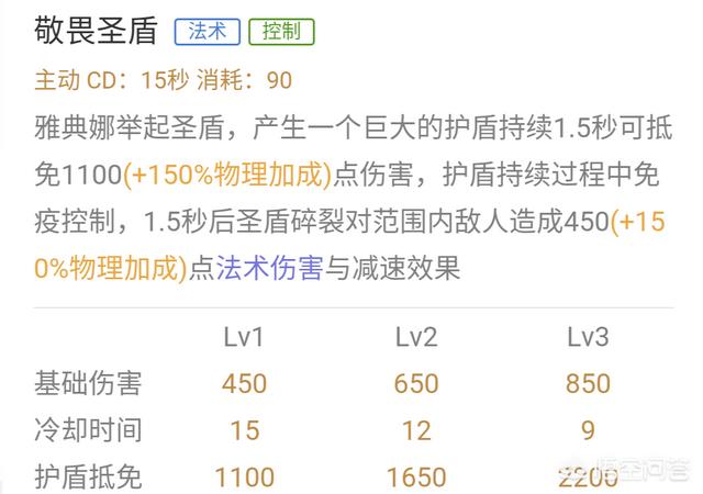 4.大招 原地释放圣盾。获得巨大免伤护盾。持续1.5秒。不可移动。1.5秒后圣盾碎裂对附近敌人造成法伤并减速50%。持续1秒。护盾存在期间雅典娜免控。