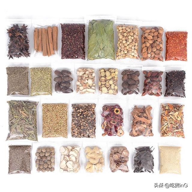 1、八角。又名大茴香、木茴香、大料。八月珠。味道甘、香。性味辛、温。具有调中开胃、散寒止痛、杀虫避秽、解鱼肉毒的作用。八角能除肉中臭气。使之重新添香。故又名茴香。在卤菜中起着。增香去腥解腻增鲜的作用。一般50千克的水或汤需要添加八角50克左右。阴虚火旺者少食。市场上有很多假的八角。假的八角常多发育不规则。不是八角形。常有尖头。弯曲。果非八角那样甜香味。或为味淡。麻舌或微酸麻辣。或微苦不适。