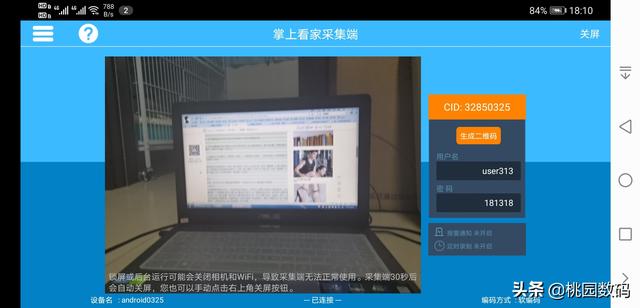 当采集端启动以后。会生成一个二维码。然后用监控端扫描一下这个二维码就会连接成功了。然后就能进行实时的监控、对讲、录音等操作了。还有很多其它功能我就不叙述了。感兴趣的话你可以实时。直接在手机的应用市场里就能搜索到。