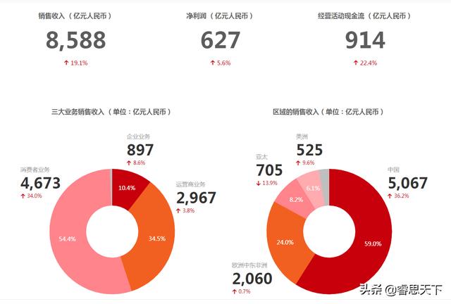 华为在2019年营业收入实现了8588亿元。比上年增长了19.1%。净利润实现了627亿人民币。