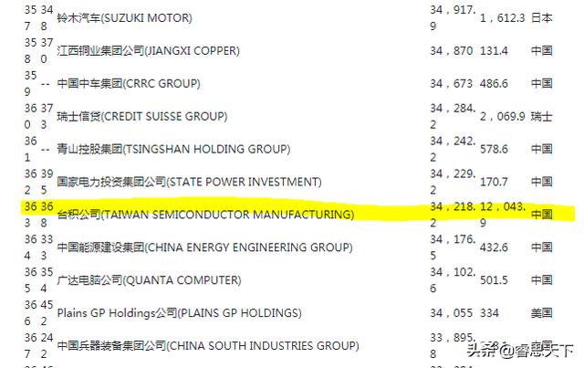 到现在为止。台积电在全球芯片代工领域内位于第一的位置。也是一家世界500强企业。2019年世界500强排行榜排在了363名的位置。