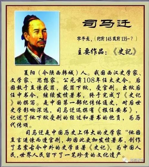司马迁是西汉的史学家、文学家、思想家。其父司马谈曾任西汉太史令。负责管理皇家图书和收集史料。司马迁幼年受到史学熏陶。成年