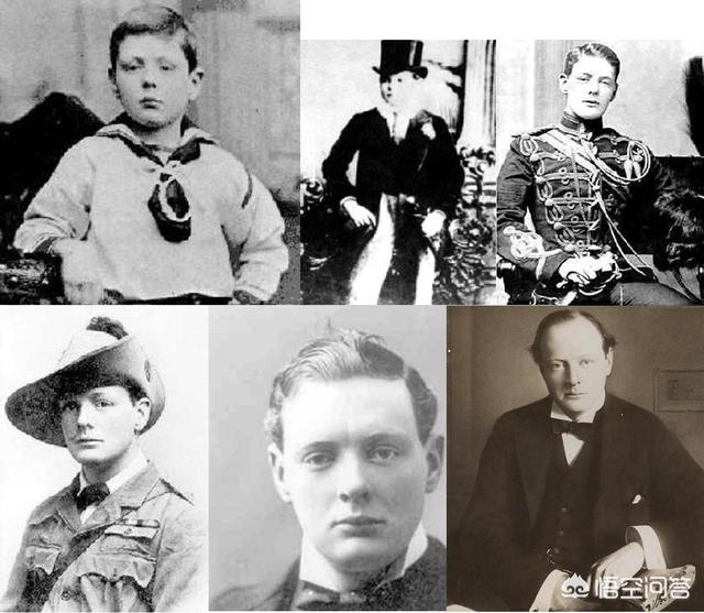(左上童年时期;中上哈罗公学时期;右上桑德霍斯特时期;左下班加罗时期;中下青年政治家时期;右下第一次世界大战前出任海军大臣时期)