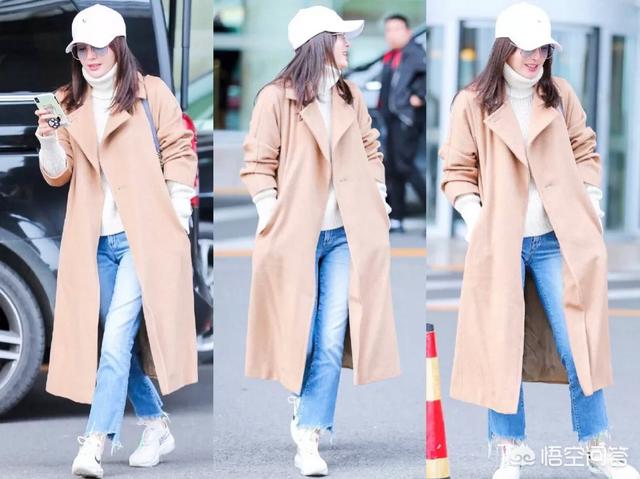 越简单越高级。几个基本款单品组合。就能轻松打造高级范搭配。秦岚身穿杏色长款大衣。内搭纯白色高领毛衣+直筒牛仔裤。配小白鞋。气质温柔又减龄。高级范满满。