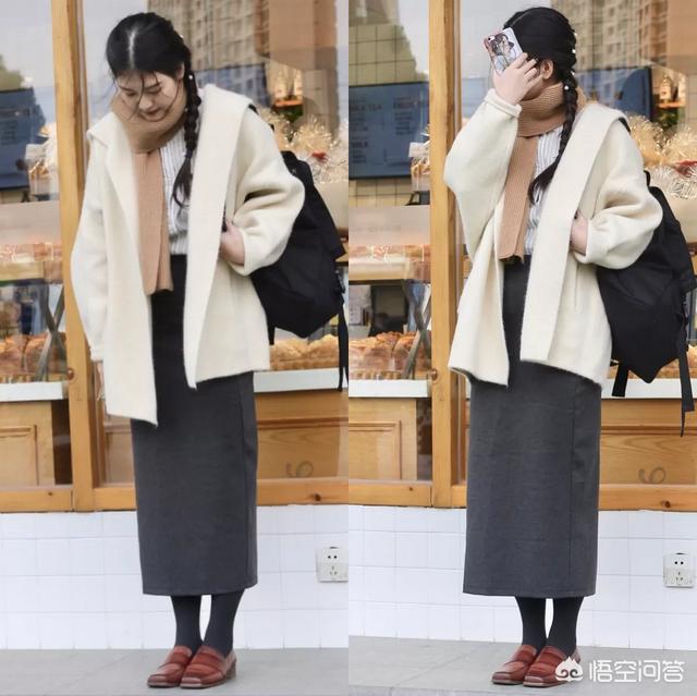 中长款大衣搭配半身裙。裙子的款式选择直筒的版型。在显温柔气质的同时保持利落清爽。再配一条围巾。温暖的淑女小清新气质!