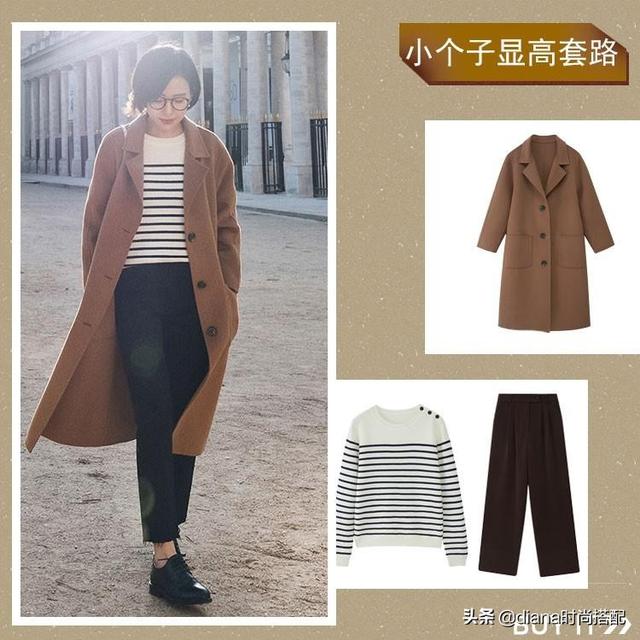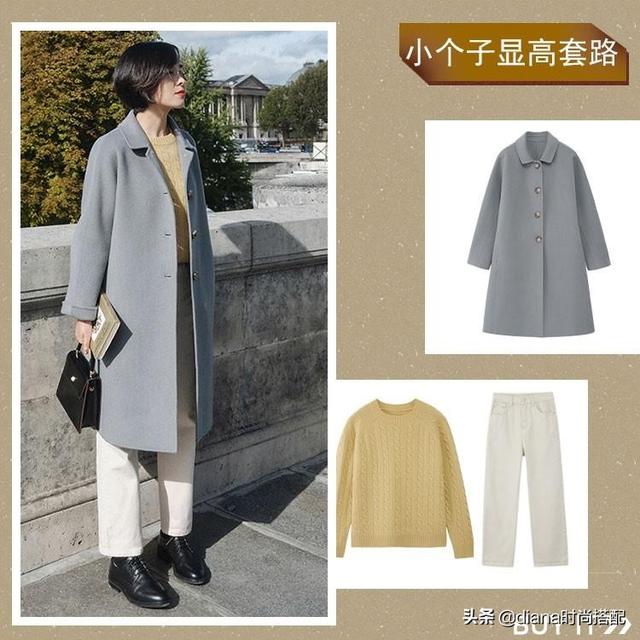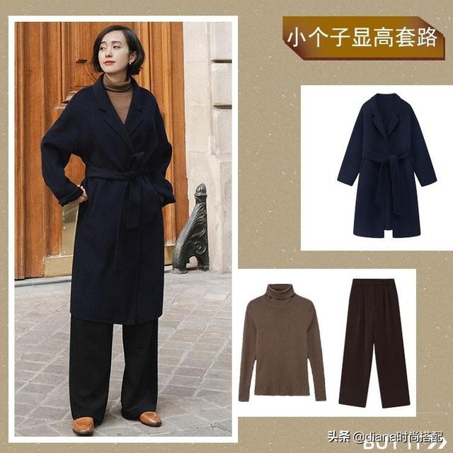 小个子女生选择长款大衣。腰线是关键。内搭毛衫和裤子黑白配。挽起裤腿。搭配一双及踝皮靴。既能突显腿长。又显瘦。简约的搭配充满高级。