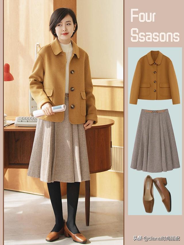 小方领的短呢子衣。搭配千鸟格半身裙也超飒!浅口的小皮鞋可以说是白领必备单品了!
