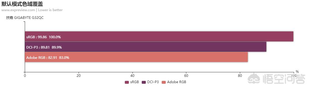 技嘉 GIGABYTE G32QC显示器的色域覆盖率也基本符合其官方所宣传的素质。sRGB覆盖率达到了99.86%、DCI-P3的覆盖率达到89.81%而Adobe RGB的覆盖则去到了82.91%。