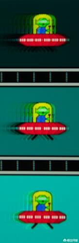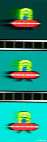 看得出来不论是在哪个响应时间设置之下都有拖影的存在。在默认的「平衡」模式下。可以看到在上面和中间的小飞碟旁边都有一圈的拖影。而且在最下面的小飞碟中更是出现了一点的逆残影。