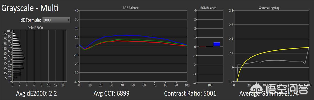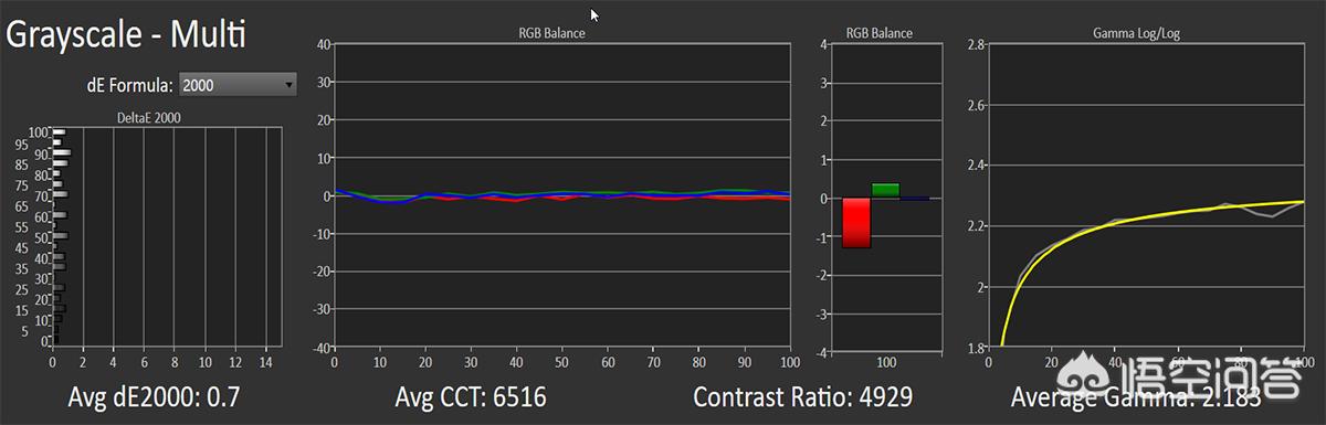 而在经过手动调整加上Calman软件校色后。伽马值去到了2.18。虽然还没有到2.2但是也比原本的2.07好很多。白平衡平均ΔE也确实为0.5。同样比起原本的好不少。