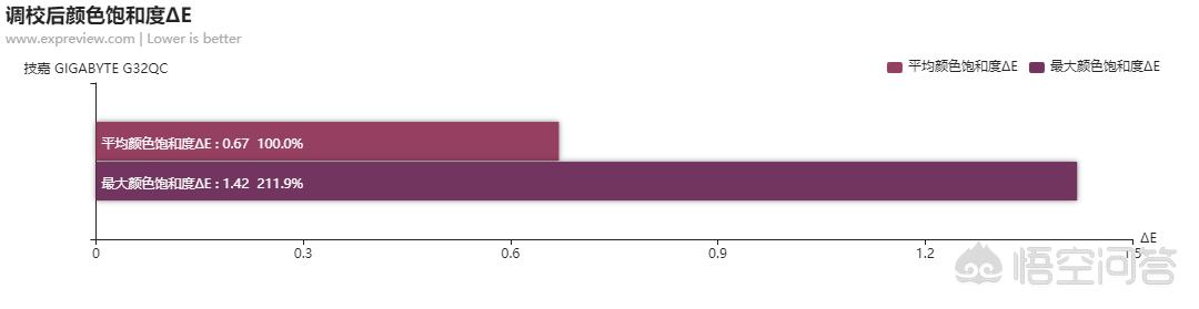 而在色彩准确度方面。显示器最理想的色准ΔE为低于2。而技嘉 GIGABYTE G32QC显示器的sRGB平均色准ΔE为2.61。最大为4.16;在颜色饱和度ΔE方面。其平均ΔE为1.74。最大ΔE则是3.85。