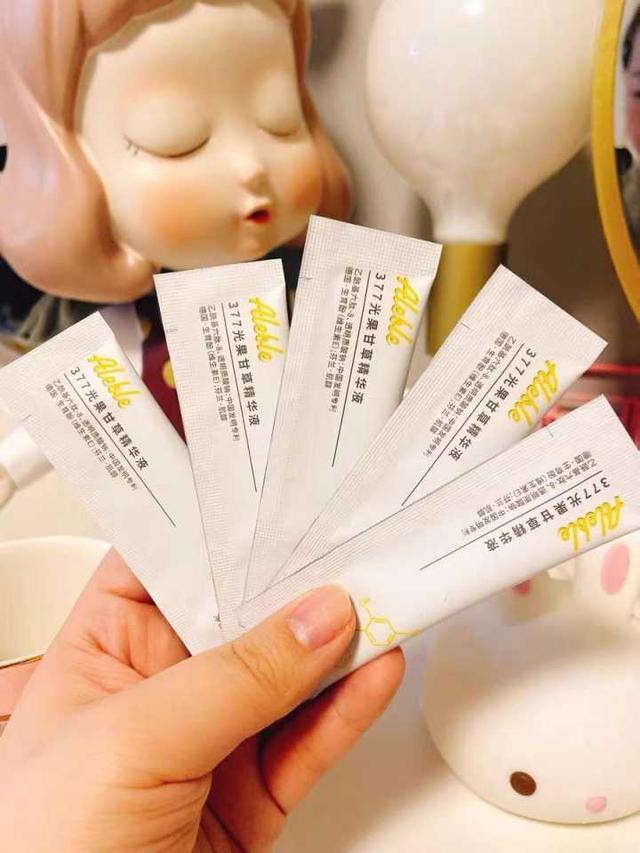 包装算是好看的一款了……主要是一袋一袋的。一盒40袋。超便宜!!377、美白“黄金”之称的光果甘草、还有二裂酵母、谷胱甘肽。成分超值!!感觉赚大发了!质地很润好吸收。每一袋独立包装干净还保鲜!淡淡的药味。有酵母反应会有点酸味。