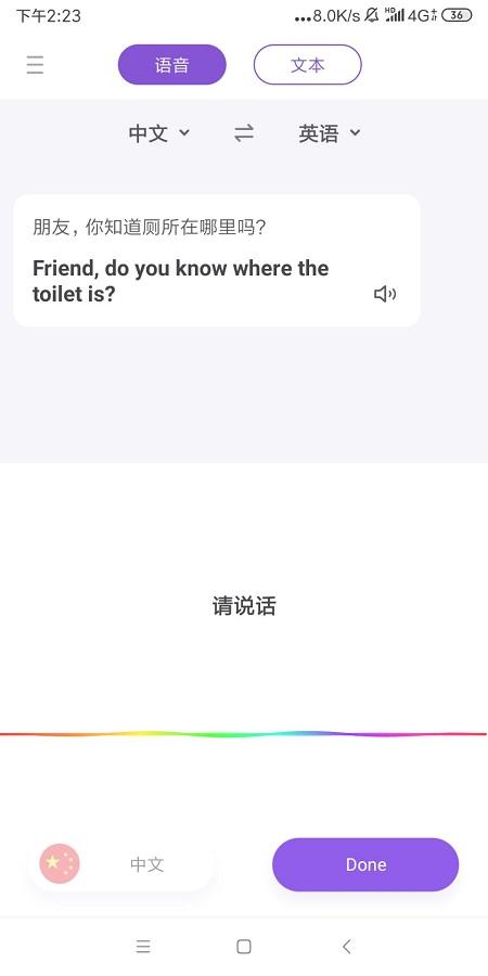 3:英文翻译器在线翻译英语页面。点击左下角的中文标志按钮。开始进行说话录音。录音完成后点击最下角的完成按钮。开始进行中文翻译英语页面。