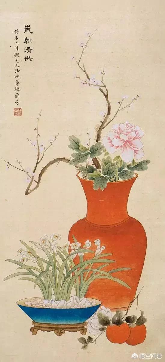 在中国绘画史上有三种文人画题材成为比较固定图式。四君子图。岁寒三友图。还有就是岁朝清供图。