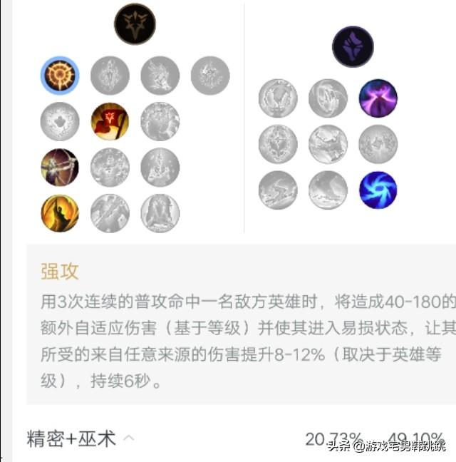 天赋强攻。副系启递巫术因阵容而定!出装方面敌方肉多的优先考虑破败 黑切之内的。敌方控制多的优先考虑夜之锋刃 水银弯刀。正常出装攻速鞋 破败 吸蓝刀 无尽之刃 火炮!出装因阵容而定。没有死出装的!