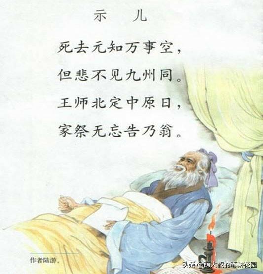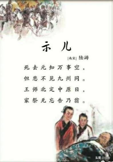 第一句中“万事空”。人死如灯灭。生死之间。什么事都是空的。不重要的。“元知”二字给人感觉临终时好像还是有没交待完的事。还有“不空”的。“但悲不见九州同”。悲伤所在的是看不到国家的统一。人死了。还记挂着祖国的山河。如果一个人没有切入肌肤的爱国深情。怎么会在临终这样的牵挂。“王师北进中原日”。陆游一直相信国家有信心、能力收复失地。统一山河。相信宋朝的军队能收复前朝故地。“家祭勿忘告乃翁”。给儿子安顿有好消息一定要祭祀时给他说。