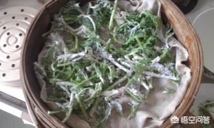 4、 茼蒿表面裹上薄薄一层面粉。放在蒸笼上。蒸笼下面要提前铺好潮湿的屉布。(茼蒿容易出水。裹上面粉可以降低营养成分顺水溜走。这也是不用水焯的原因。而且可以很好地保证茼蒿的形状)