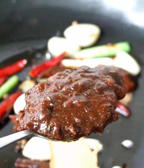 豆瓣酱在热油中煸炒充分。酱香味道才会浓郁。但要注意不要炒煳。用小火。并不断划炒。