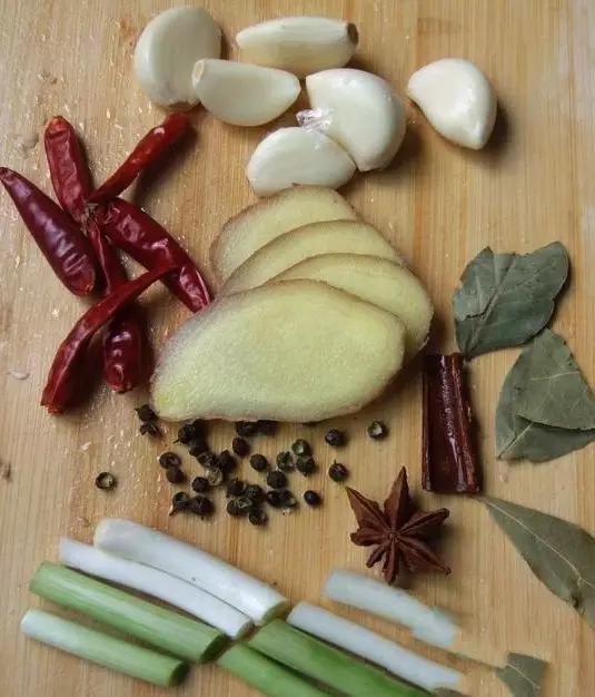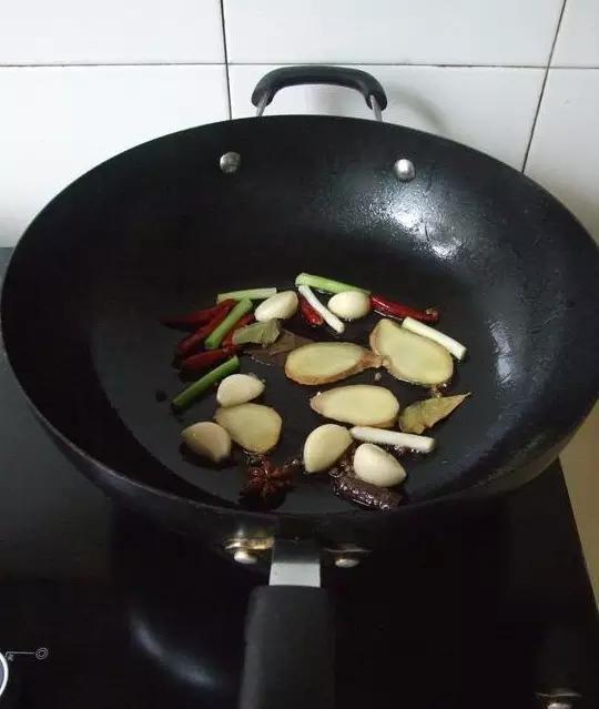 6、起油锅。爆香葱姜蒜、干红辣椒、八角、花椒、香叶和桂皮;