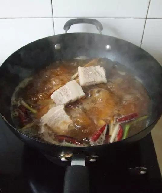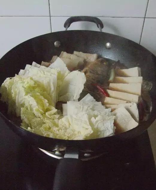 9、下入煎好的鱼和花肉。大火煮开后转中火炖制;