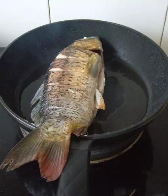 4、鲤鱼去鳞去鳃去内脏。清洗干净后沥干水分。擦干鱼表面的水分。入放油的平锅。大火煎至双面金黄;