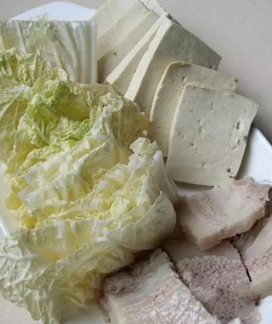 3、老豆腐切大片。煮熟的花肉切大片。白菜切大块备用;