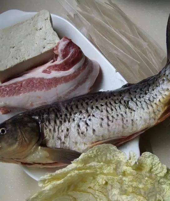 原料:鲜活鲤鱼1000克、花肉250克、豆腐400克、白菜叶3片、宽粉1把、豆瓣酱1大勺、干红辣椒6个、八角1个、花椒10粒、香叶3片、桂皮1块、香菜1棵、葱姜适量