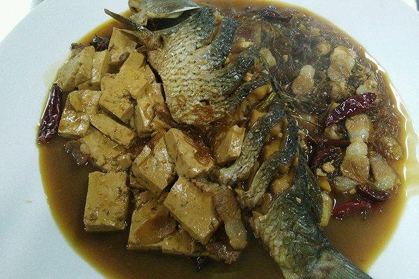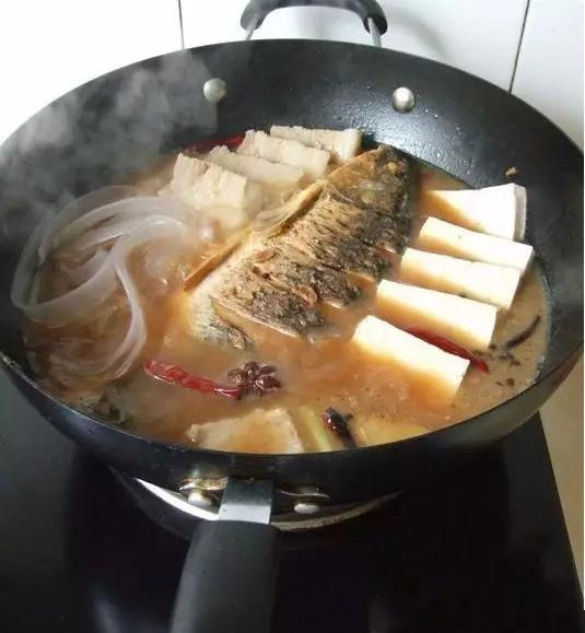 11、 炖至鱼充分入味。下入豆腐和宽粉。继续炖制10分钟;