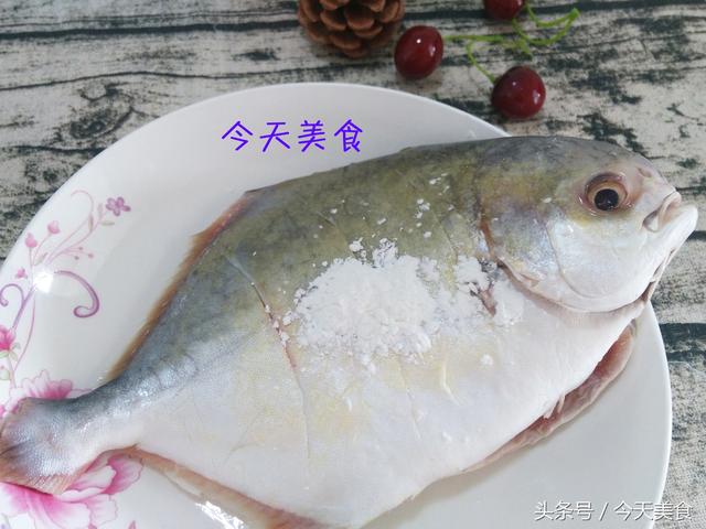 5、腌好后将鲳鱼身用厨房纸擦干净。表面均匀地抹上薄薄一层玉米淀粉。这样煎出的鱼不粘锅。不破皮不糊。