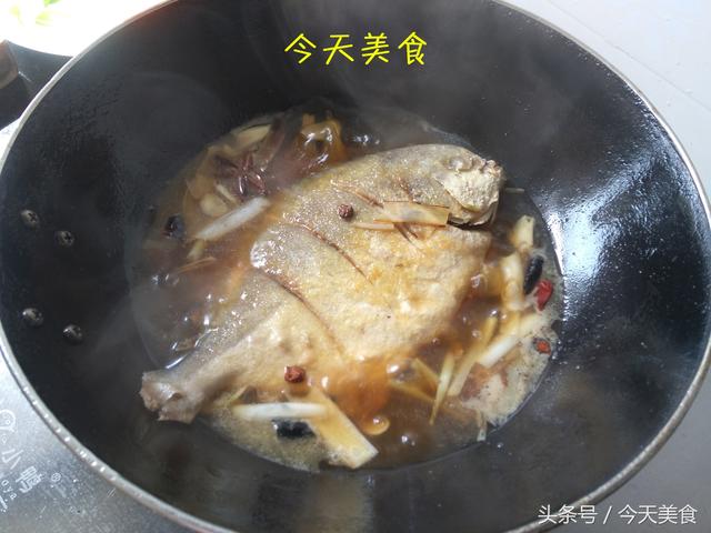9、放入煎好的鲳鱼。倒入适量清水。水不要没过鱼身。放入一汤匙料酒。生抽。醋。白糖。大火煮开后转小火炖至10分钟左右。至汤汁浓稠。